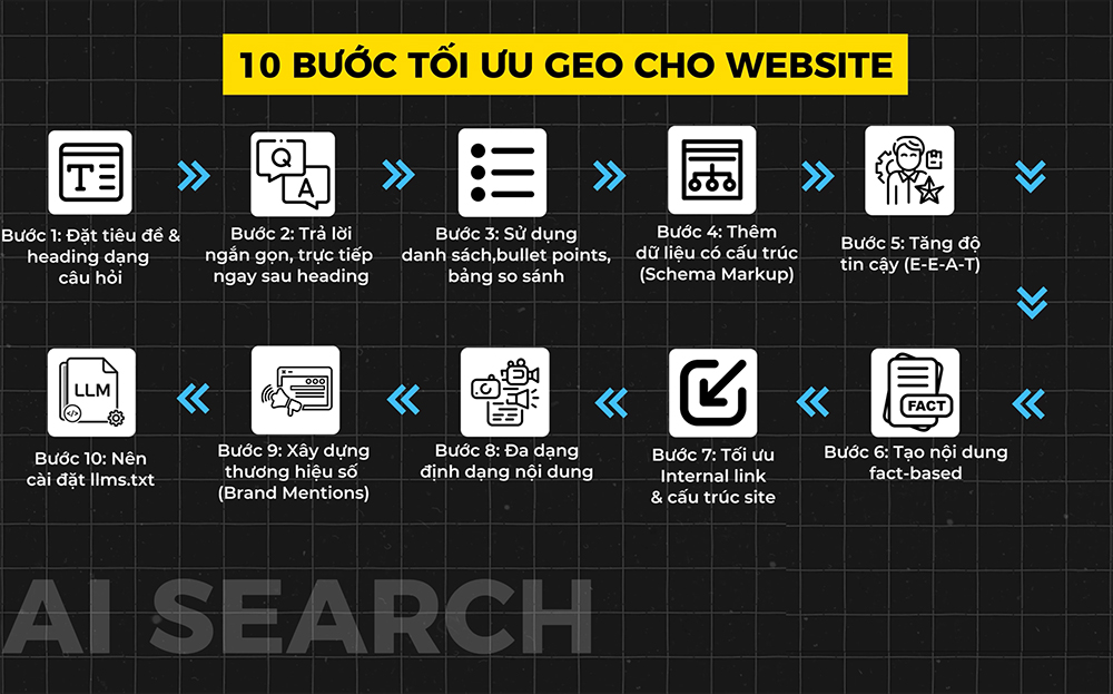- GEO web: tập trung vào khả năng đọc hiểu của AI, cấu trúc thông tin, E-E-A-T, dữ liệu có thể trích xuất (extractable), và tính cập nhật.
